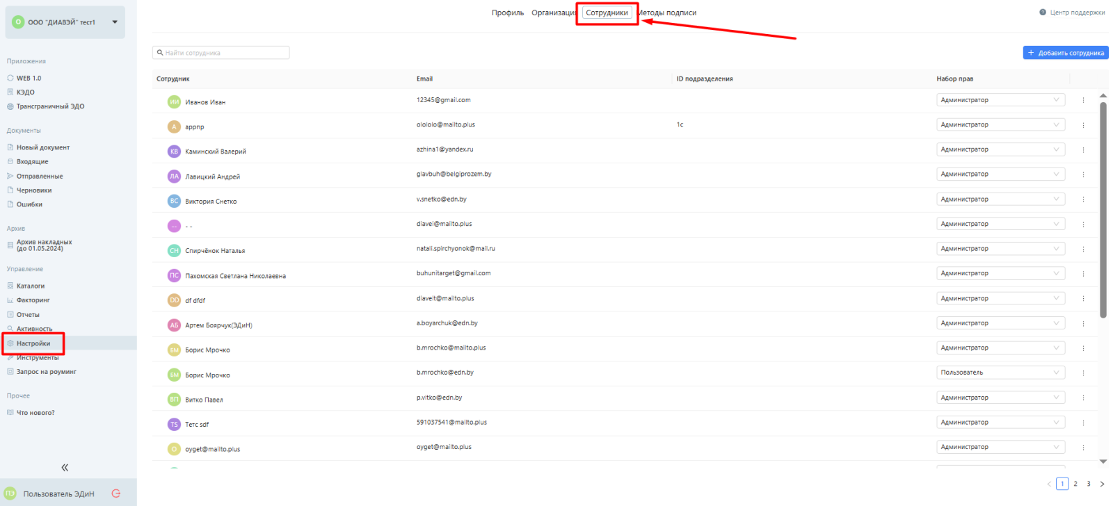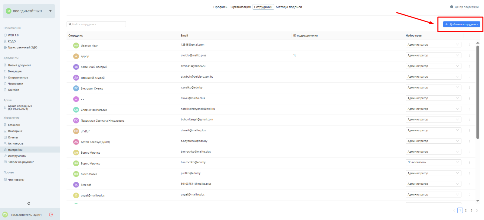 Администратор - настройка организации, добавление сотрудников, полная работа с документами