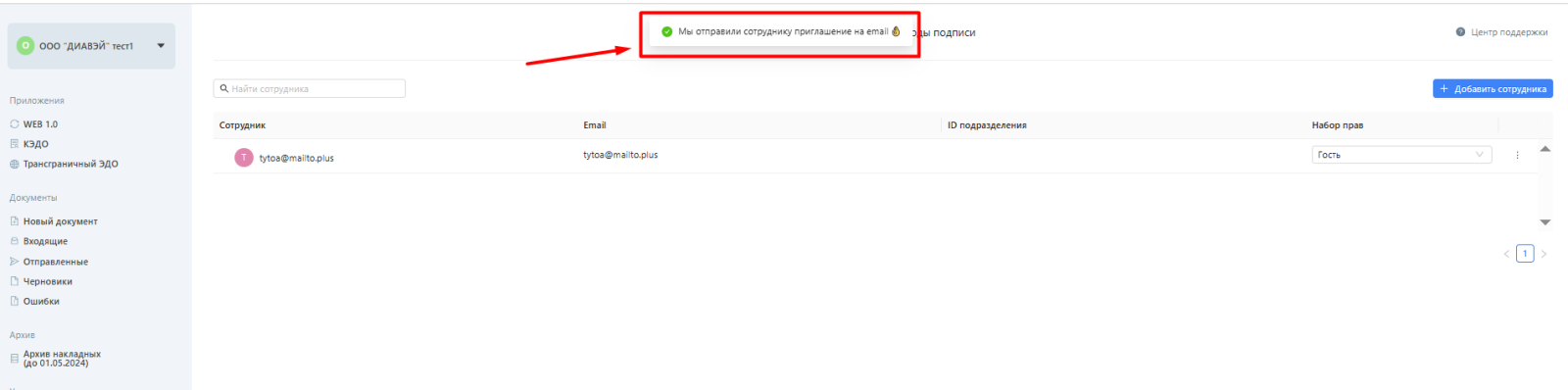 Если указанные выше действия были выполнены корректно, появится всплывающее окно с текстом "Мы отправили сотруднику приглашение на email".