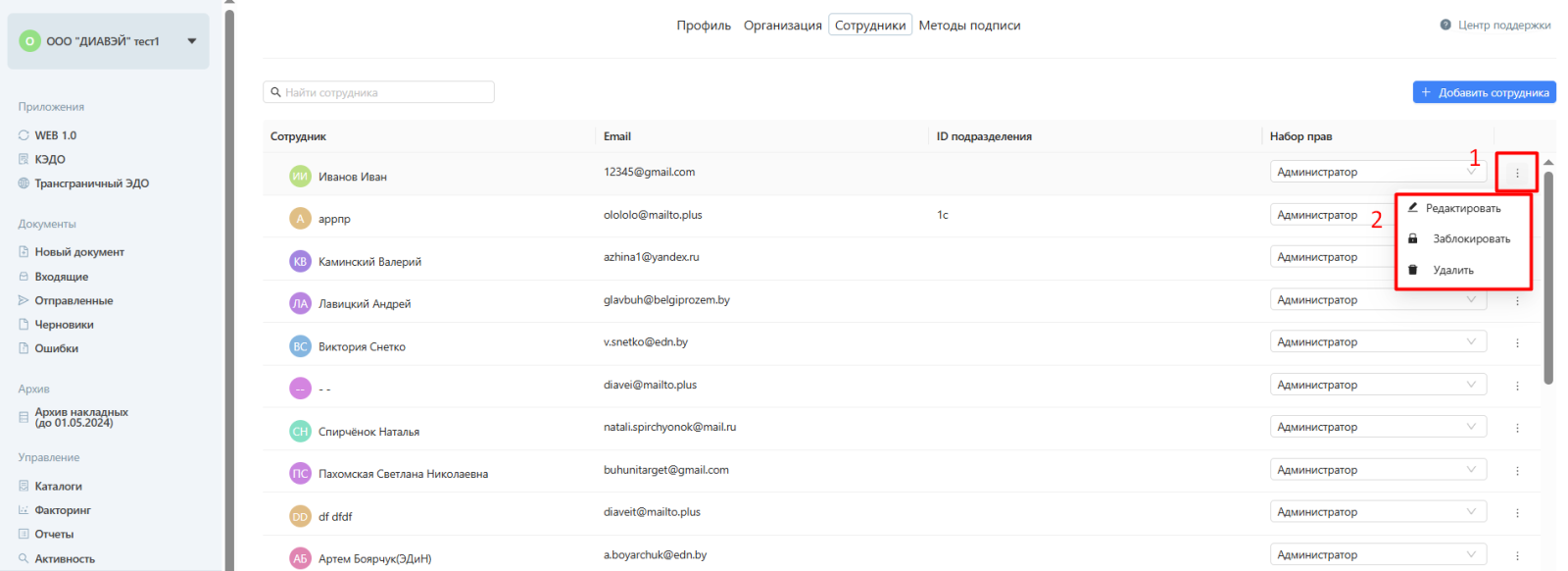 Для того, чтобы внести изменения в сотрудниках, необходимо нажать на значок "троеточие" справа от записи пользователя и выбрать одно из действий (редактировать, заблокировать или удалить).