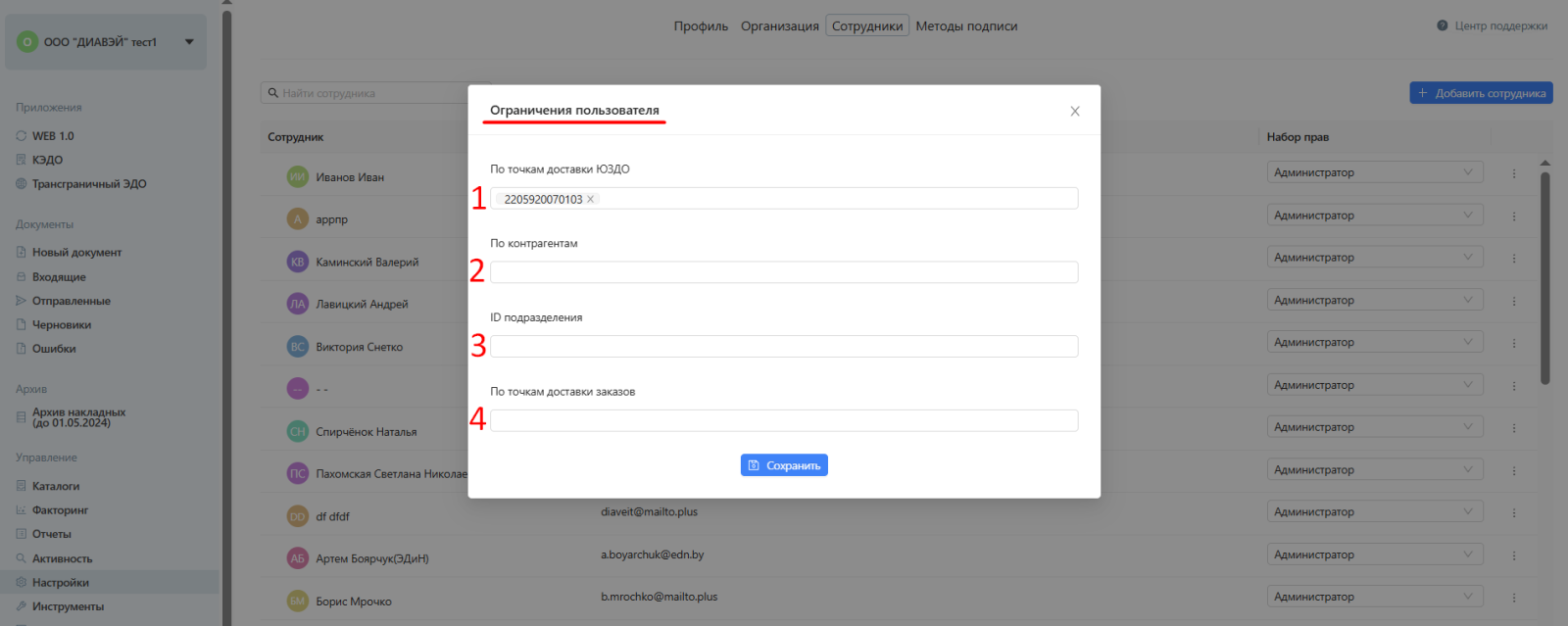 - При ограничении пользователя по точкам доставки ЮЗДО и/или по точкам доставки заказов обязательно указывать 13-значный номер GLN (ILN). Если внесены буквы либо количества цифр больше или меньше 13, то будет отображаться ошибка и данные нельзя будет сохранить.