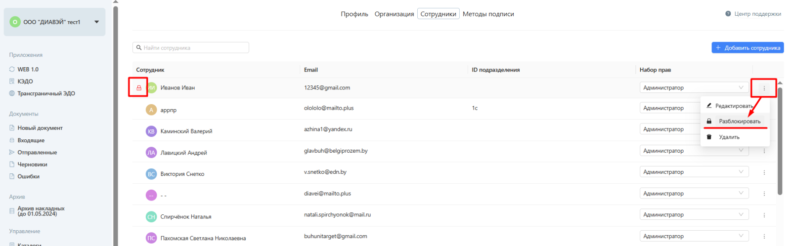 Блокировка/разблокировка сотрудников