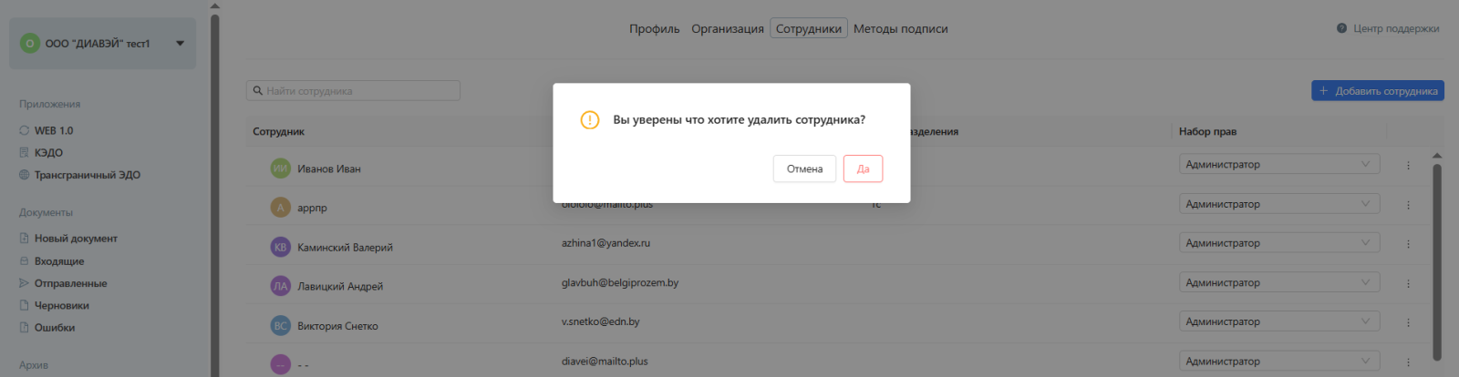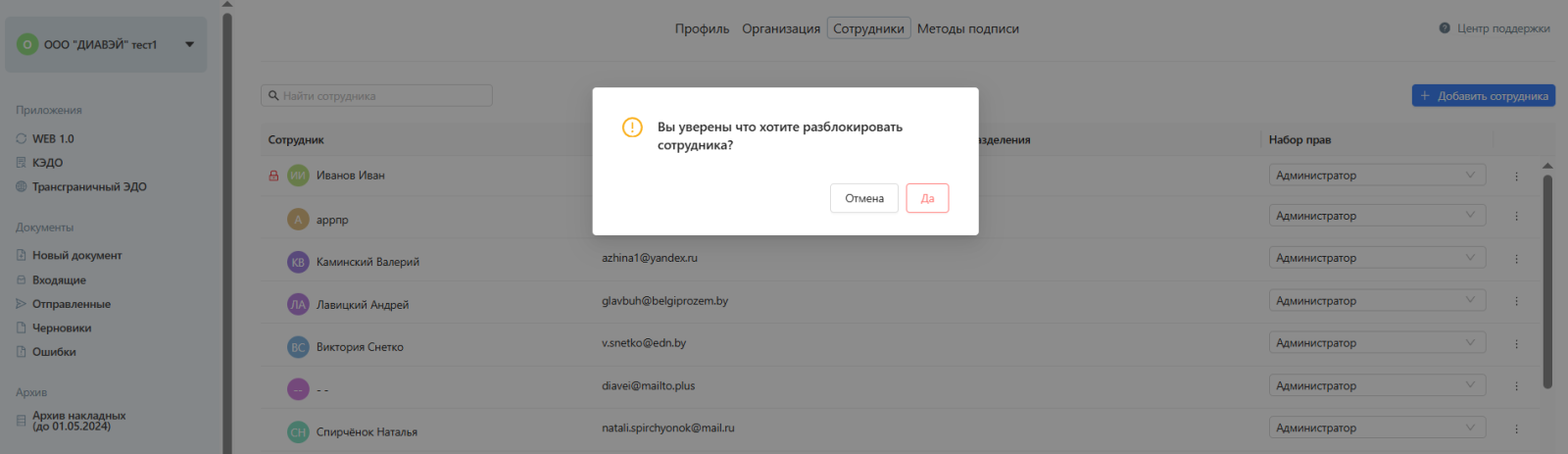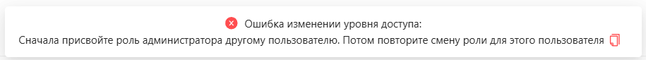 ВАЖНО! Если Администратор понизит свои права ошибочно, вернуть прежнюю роль сможет только другой Администратор компании или Техническая поддержка ЭДиН. Если в компании числится только один сотрудник (по умолчанию это должен быть Администратор), он не сможет понизить свои права. При попытке совершить подобное изменение будет выведено предупреждающее уведомление и прав останутся неизменёнными.