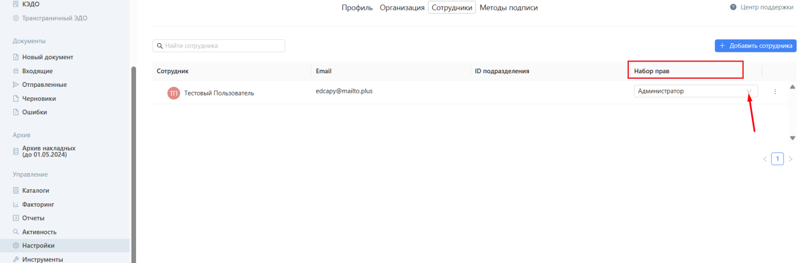 Изменение набора прав сотрудника