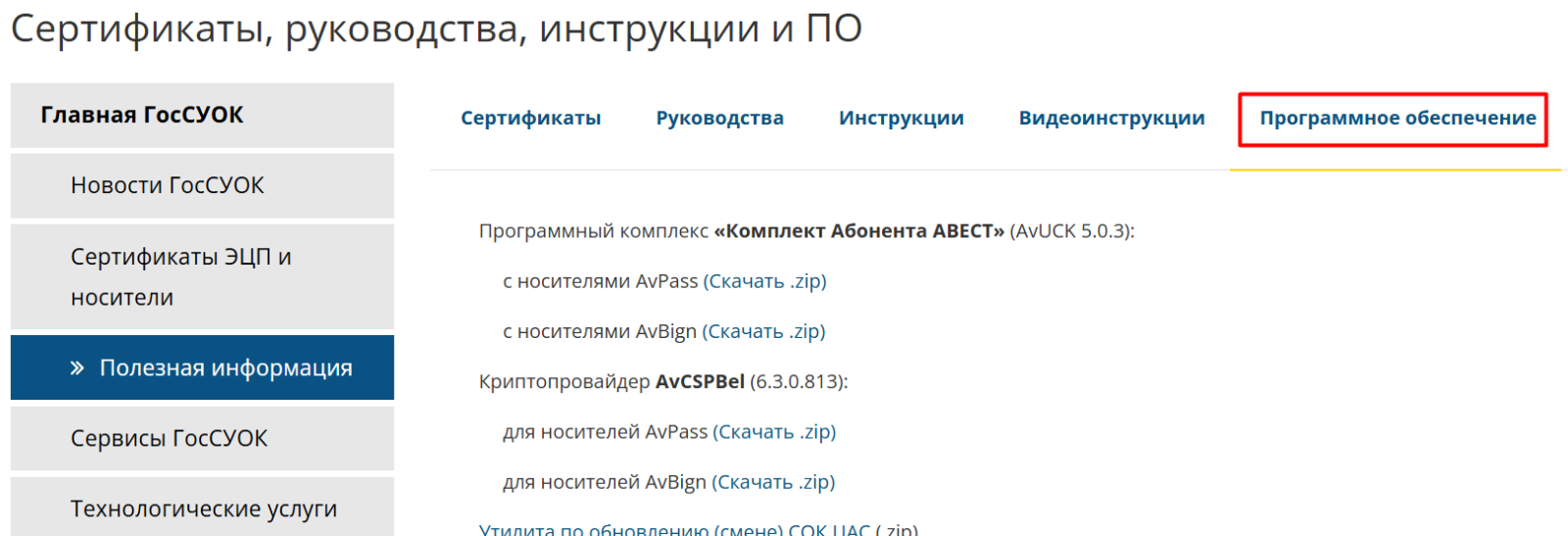 Скачать и установить необходимое криптографическое ПО можно с сайта "НЦЭУ", перейдя по ссылке https://nces.by/pki/info/software/ .