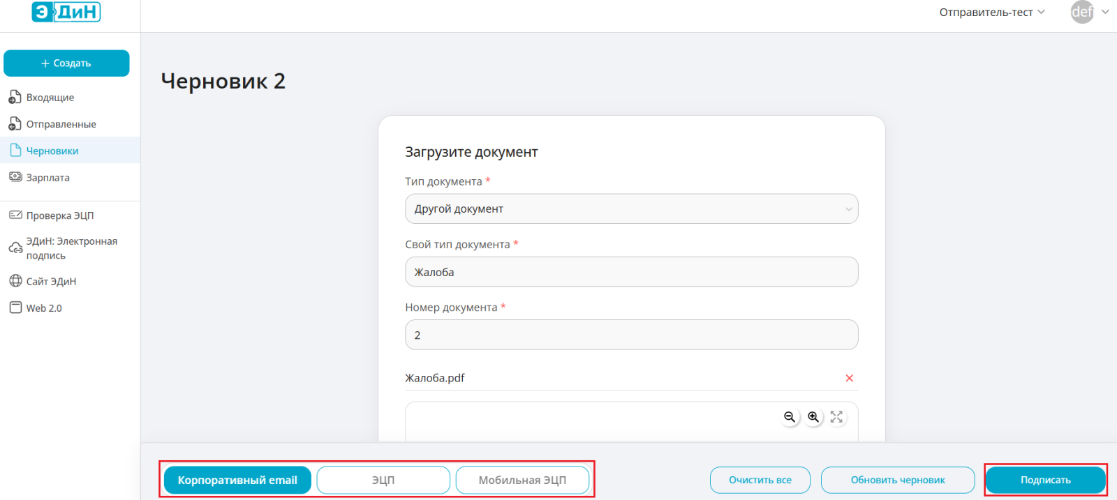 - Откроется форма для редактирования. Здесь можно внести изменения в черновик, при необходимости. Затем выбрать тип подписи, если в профиле указаны оба (нижний левый угол), нажать на кнопку “Подписать”.
