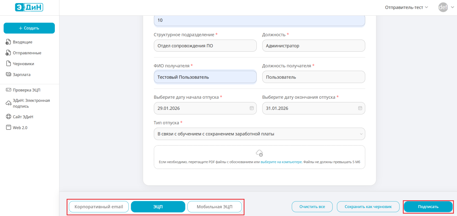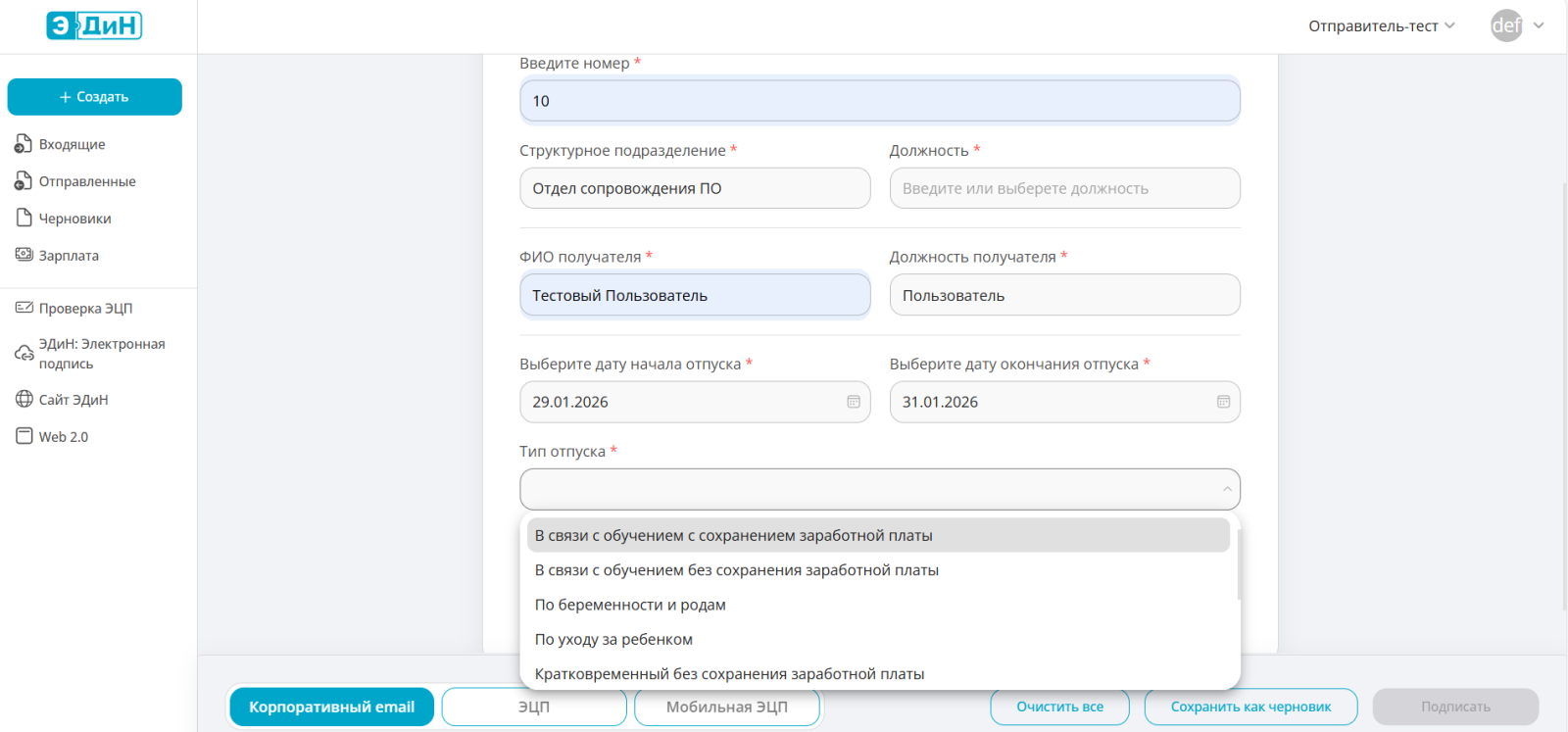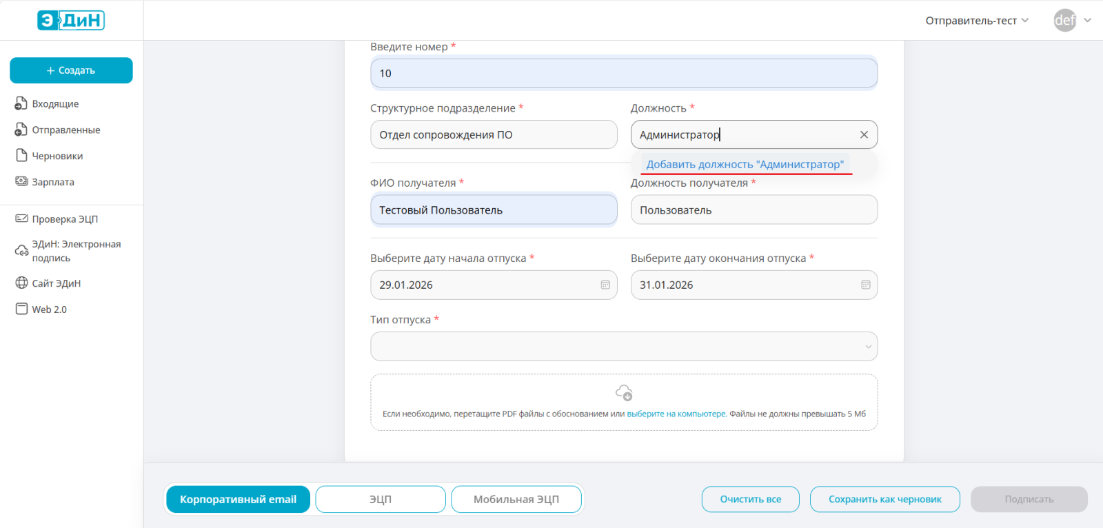 Если у сотрудника нет личного ключа ЭЦП, предусмотрена возможность подписания с помощью корпоративного email. Подробно данный тип подписи описан в инструкции.