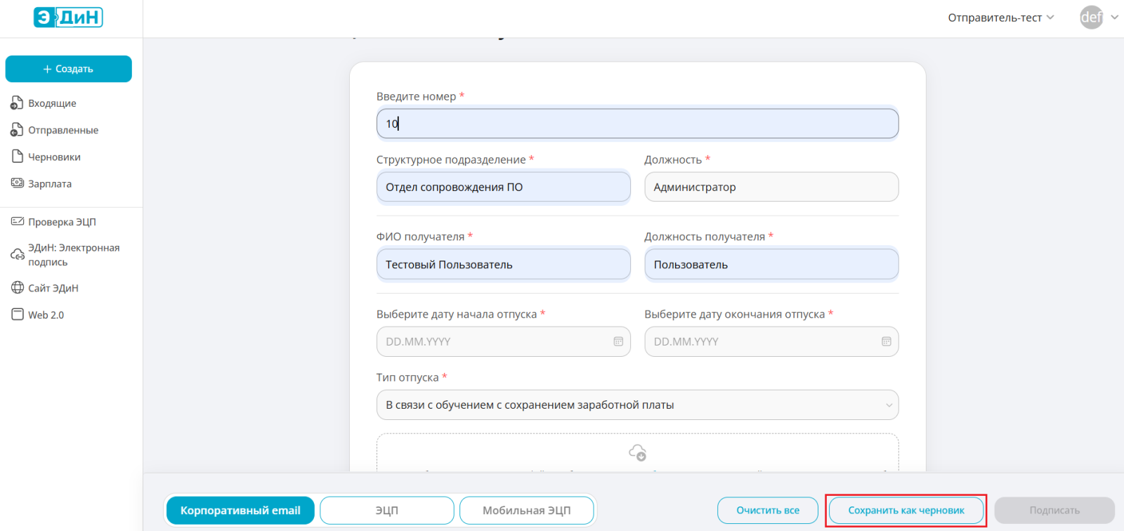 После успешного подписания Заявление на социальный отпуск можно будет найти в разделе “Отправленные”.