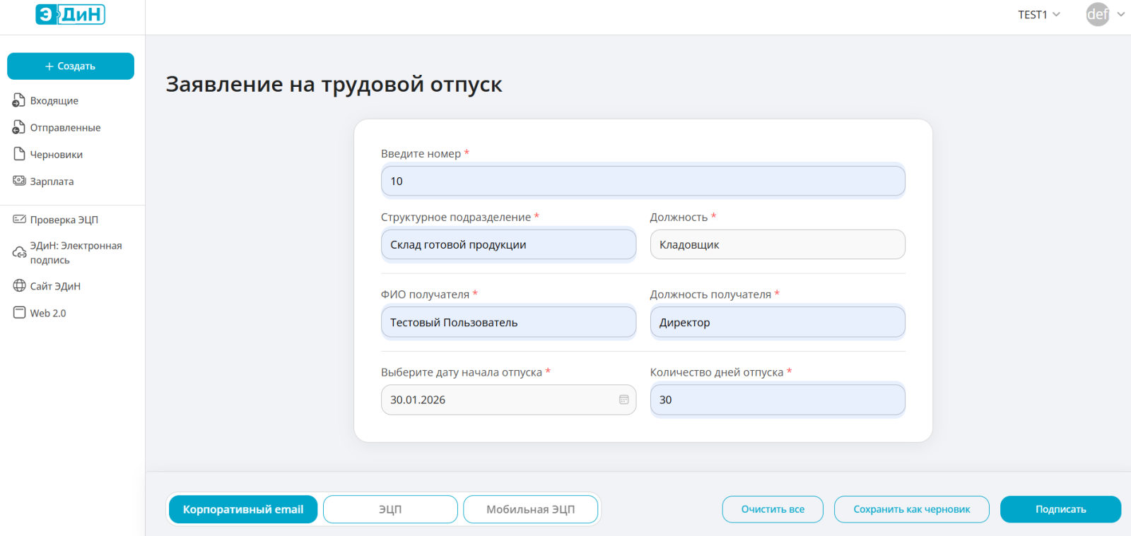 После успешного подписания Заявление на трудовой отпуск можно будет найти в разделе "Отправленные".