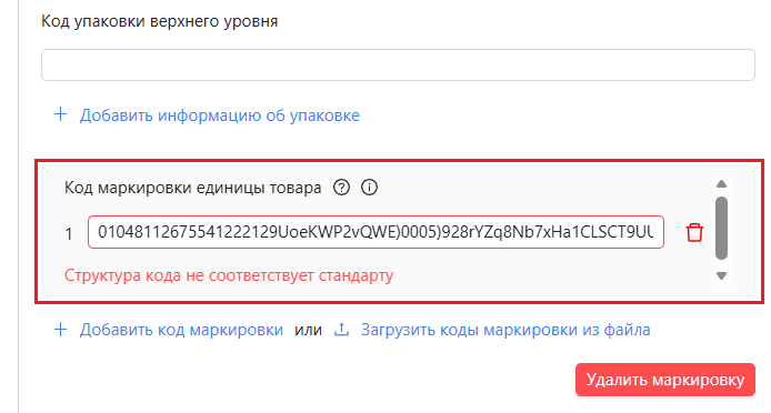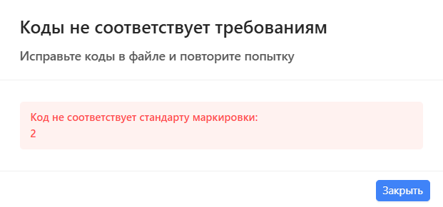 Если внесённый код маркировки не пройдет проверку на соответствие базовой структуре, появится уведомление об ошибке: