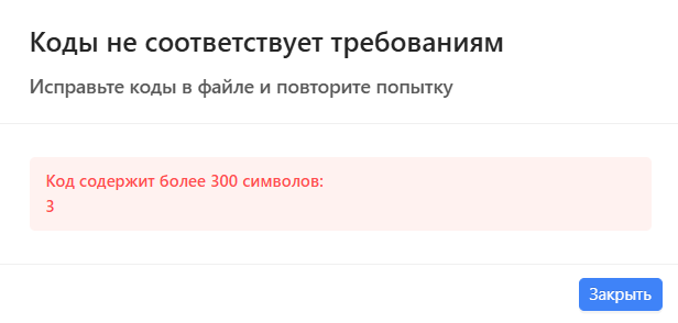 Если при загрузке файла появится ошибка “Код содержит более чем 300 символов”, нужно проверить подгружаемый файл: возможно, несколько кодов не разделены пробелом и "склеились" в один длинный код. Номер в ошибке указывает на строку с проблемным кодом.