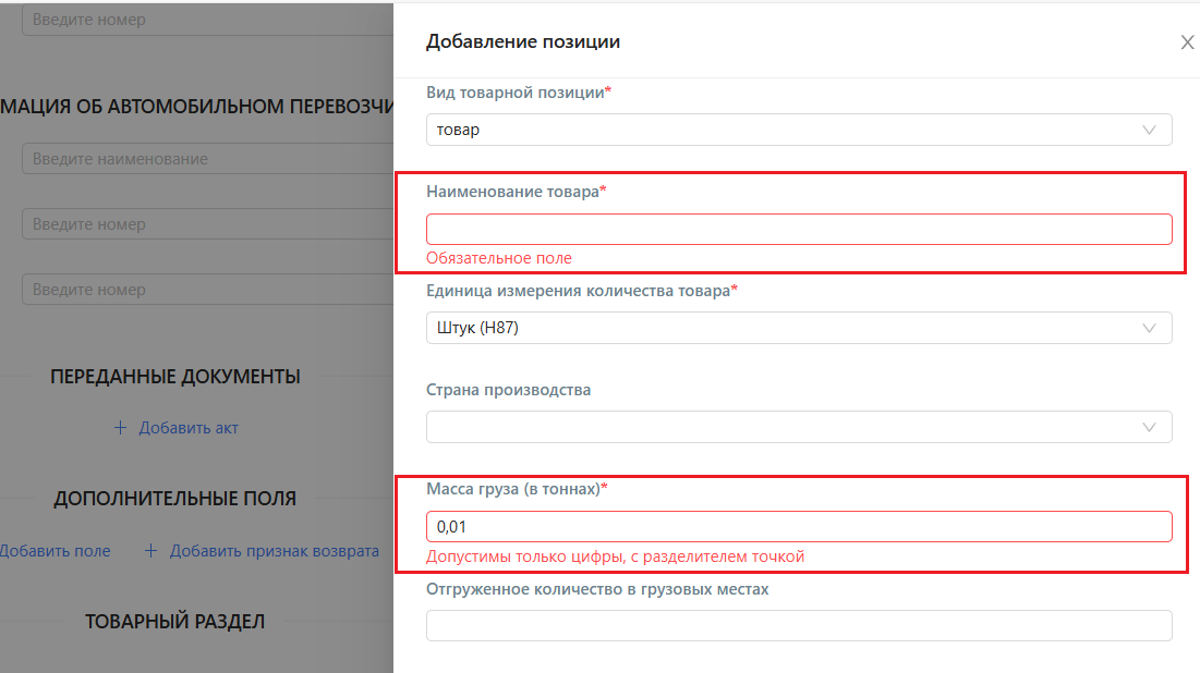 Если в товарной позиции были заполнены не все обязательные поля или заполнены некорректно, будет выполнен автоматический переход к первому незаполненному (некорректному) полю (если их несколько). Эти поля будут выделены красным цветом.