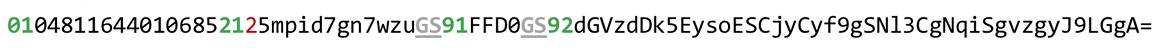 На изображении ниже приведён пример корректного кода маркировки. Идентификаторы применения прописаны зелёным цветом