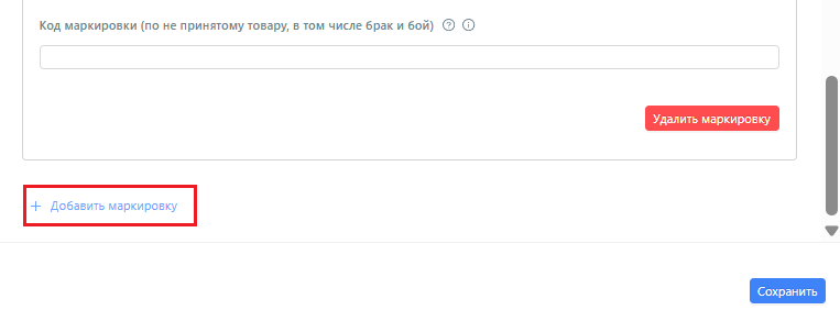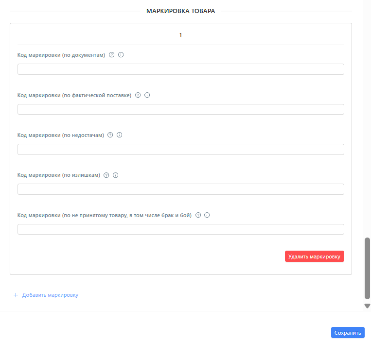 Допускается заполнение одного любого поля в блоке. Каждый новый код добавляется в новый блок по кнопке "Добавить маркировку".