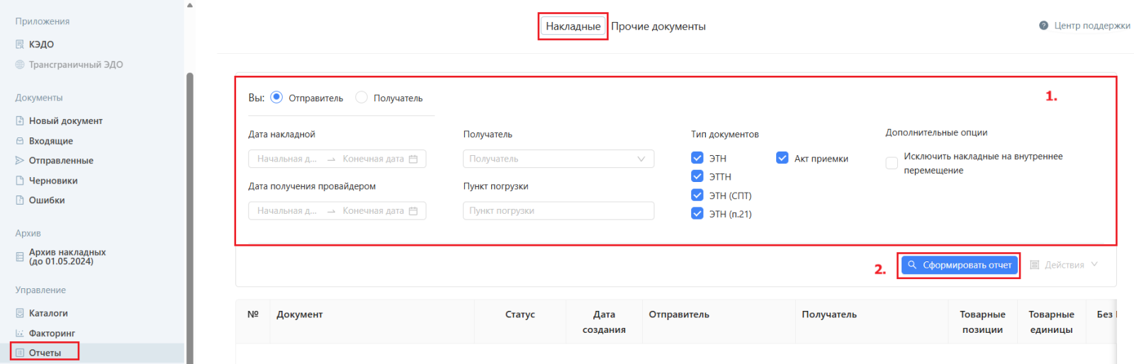 Далее необходимо выбрать тип документа ("Накладные" или "Прочие документы"), указать параметры для сортировки документов и нажать на кнопку "Сформировать отчёт":