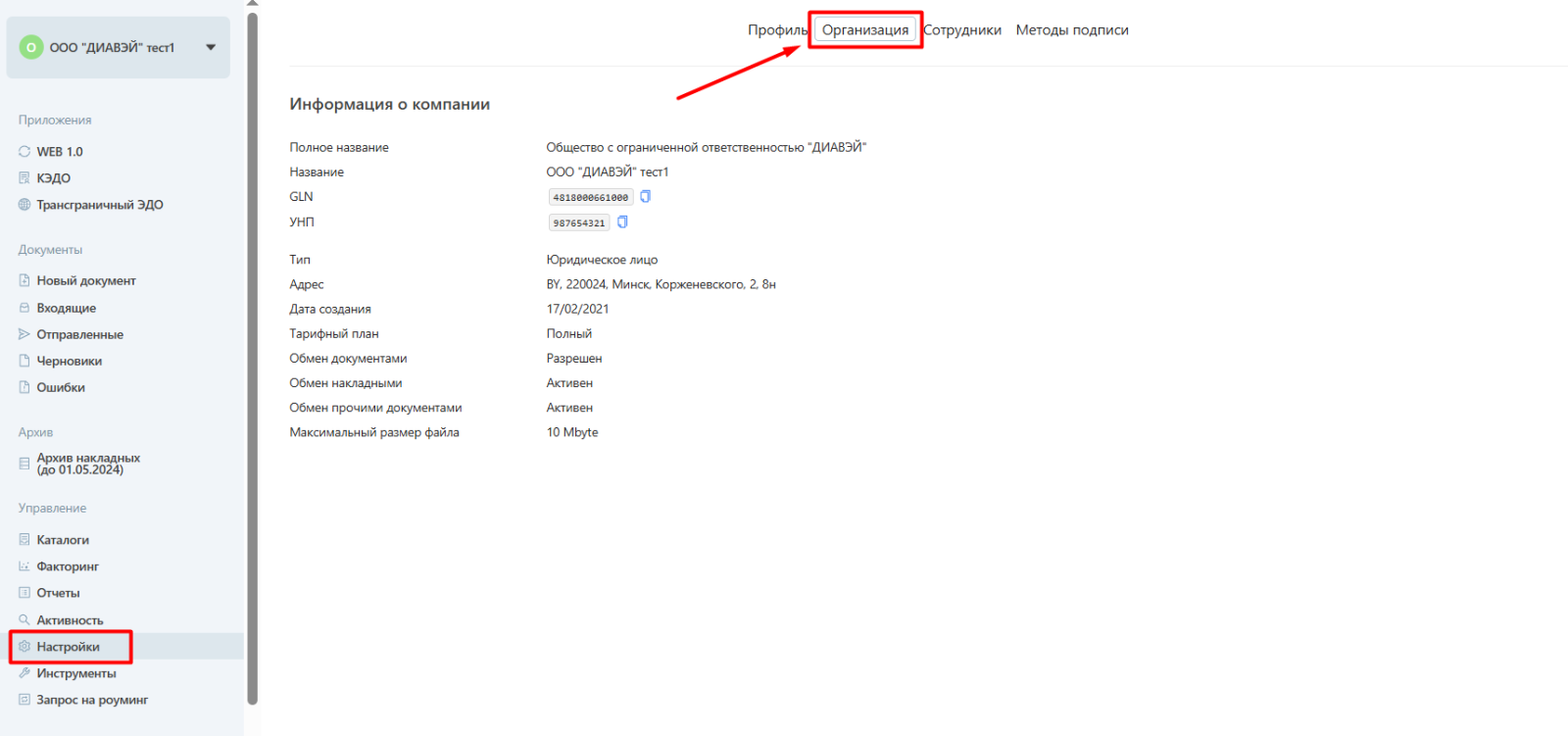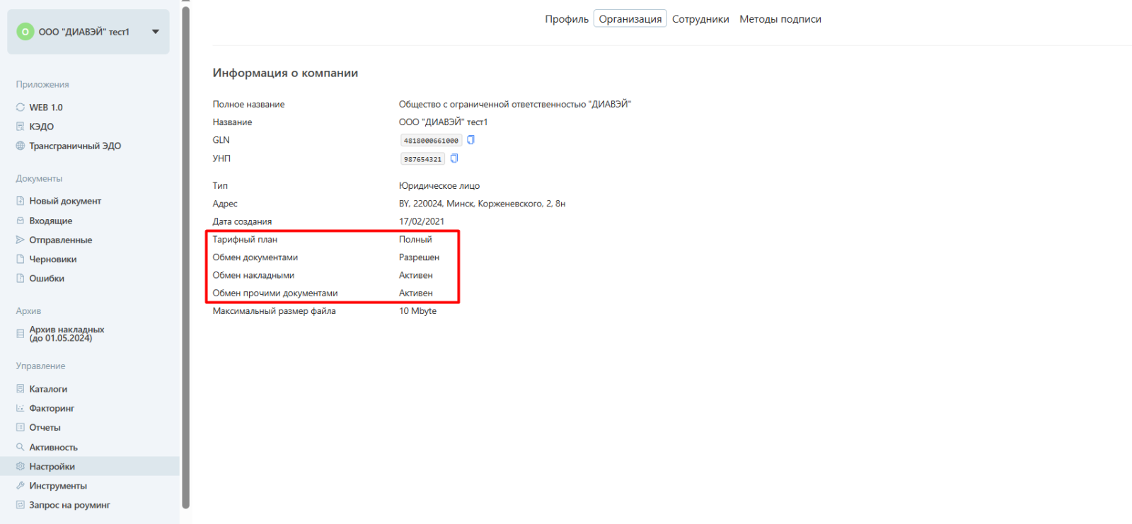 Также, в настройках организации, можно увидеть свой тарифный план, в каком статусе находится доступ к обмену документами, накладными и прочими документами: