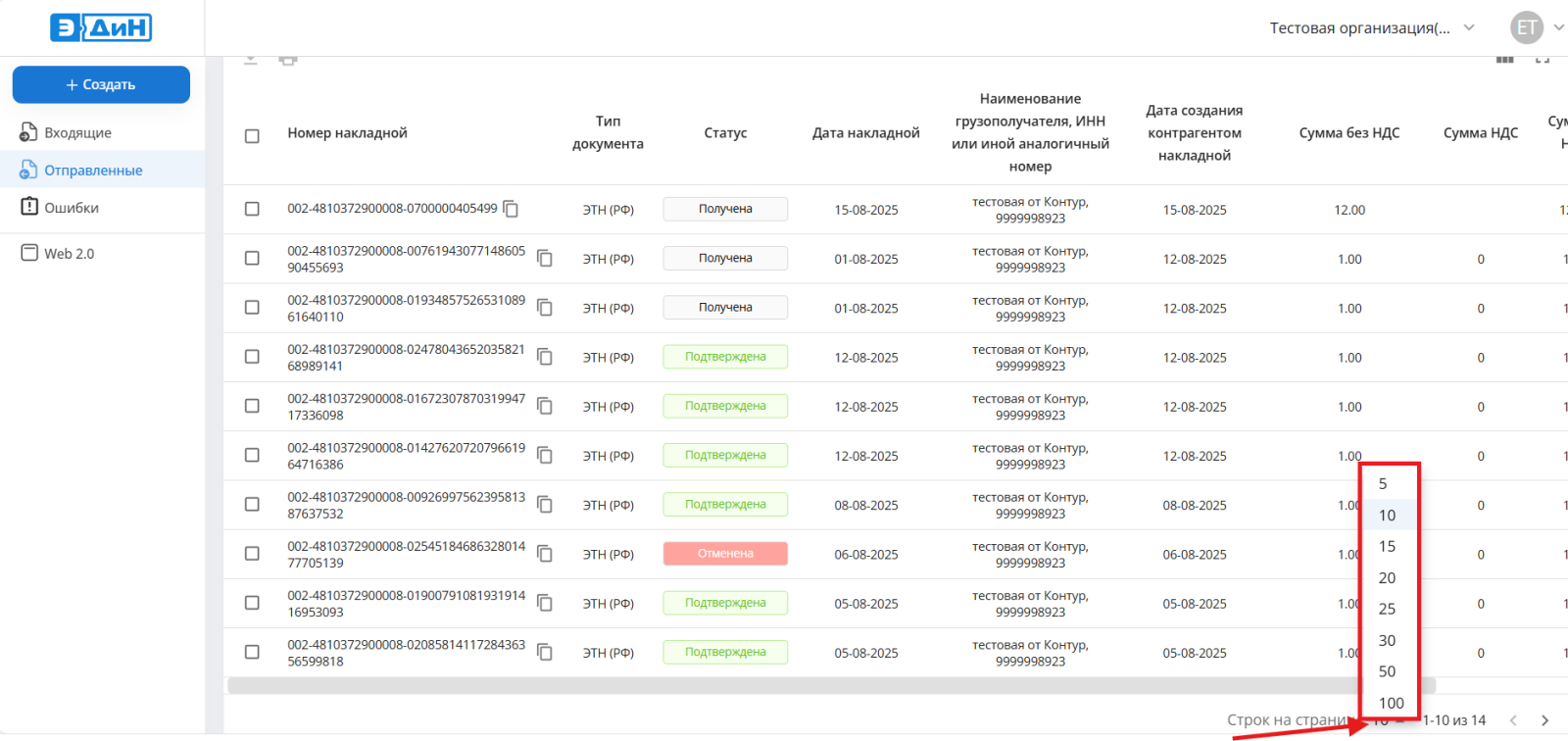 Внизу списка документов ветки "Отправленные" можно задать количество документов для отображения. Значение можно выбрать только из предложенных вариантов (5, 10, 15, 20, 25, 30, 50 или 100):