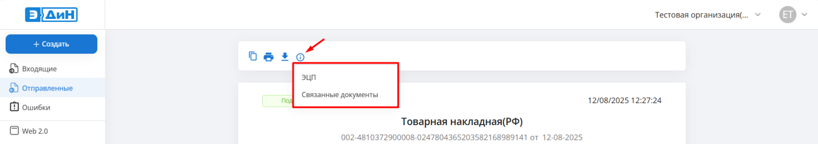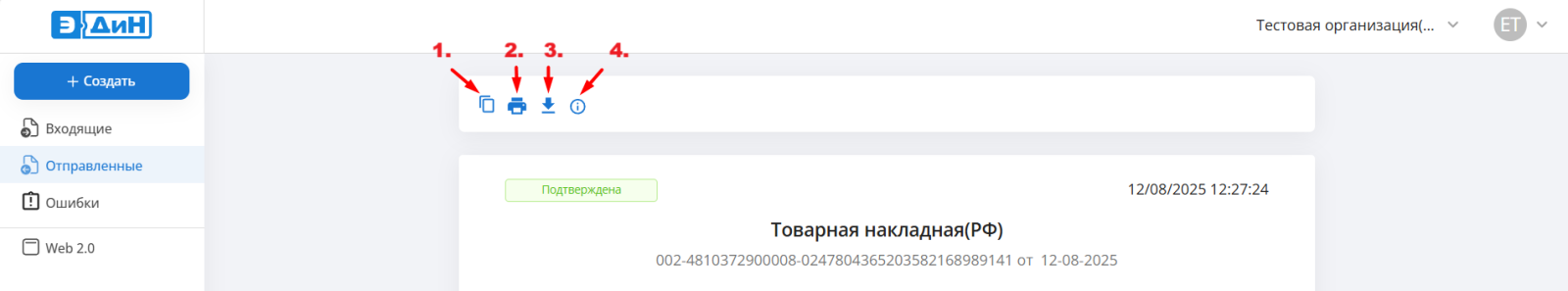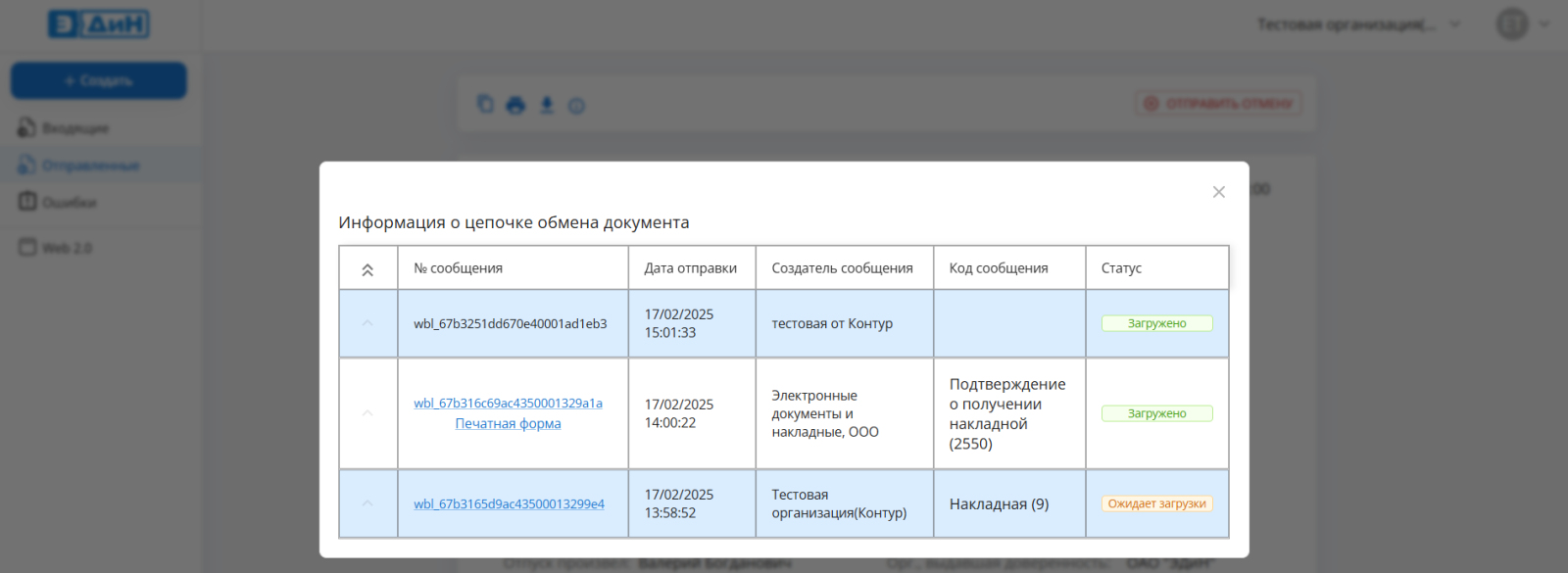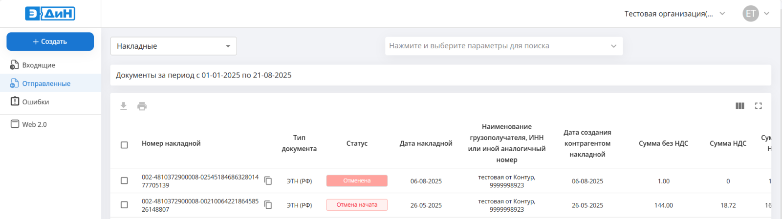 На основной вкладке "Отправленные" документы будут отображаться в таком виде: