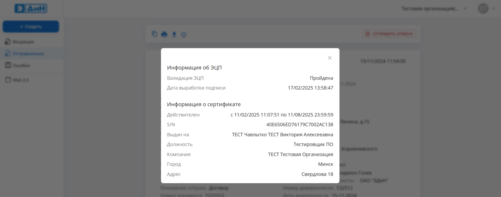 В случае выбора "ЭЦП" мы получаем полную информацию о сертификате и самом ЭЦП: