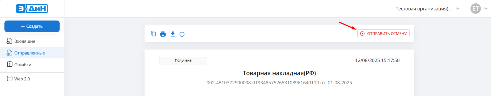 Для того, чтобы отменить накладную на РФ необходимо открыть документ и нажать на кнопку "Отправить отмену" в верхнем правом углу документа:
