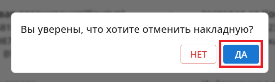 После нажатия на кнопку "Отправить отмену", во сплывающем окне с вопросом "Вы уверены, что хотите отменить накладную", необходимо выбрать "Да":