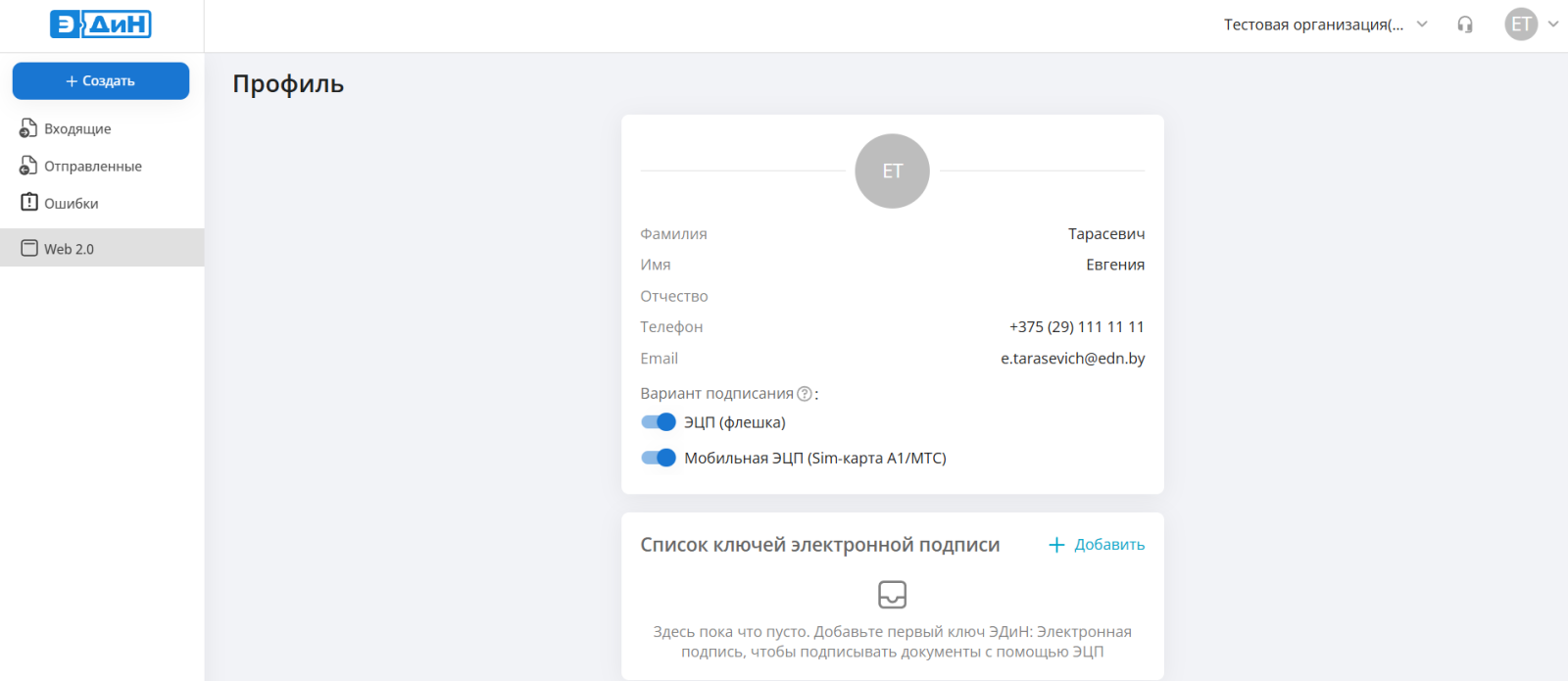 В профиле отображается основная информация о сотруднике, можно выбрать вариант подписания документов: “ЭЦП (Флешка)” и/или “Мобильная ЭЦП” и привязать ключ.