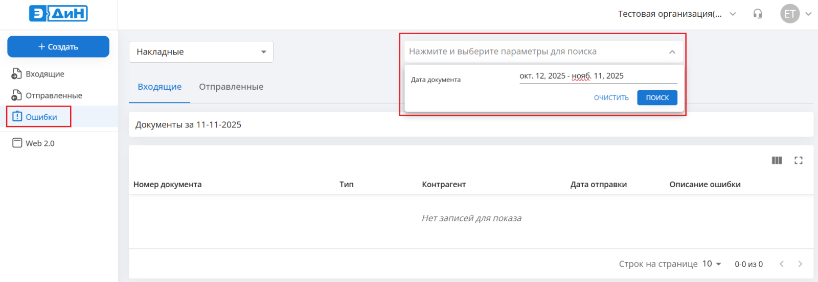 Для того чтобы найти входящие или отправленные накладные, которые попали в ошибки нажмите на фильтр поиска и выберите дату искомых документов, затем нажмите "Поиск".