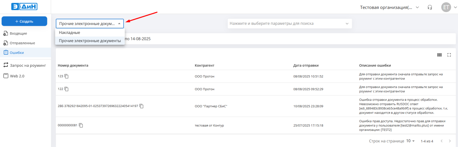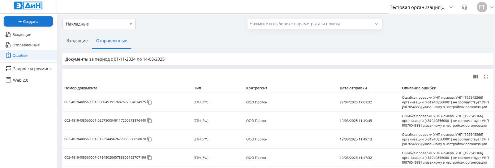 В разделе “Ошибки” можно выбрать тип документа Накладные или Прочие электронные документы. Рядом с номером документа будет указано краткое описание ошибки.