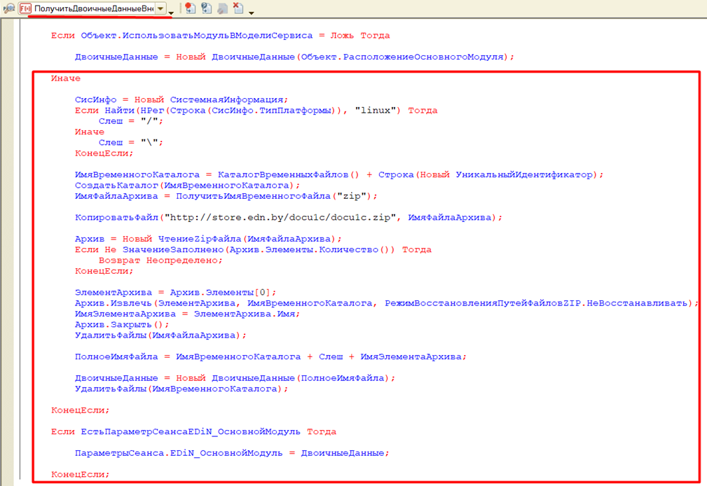 Функция «ПолучитьДвоичныеДанныеВнешнейОбработкиНаСервере» обработки формы «Запуск_Docu1c_УправляемаяФорма» для управляемых форм по получению закрытой части из репозитория сайта поддержки для запуска модуля в модели сервиса должен содержать следующий код: