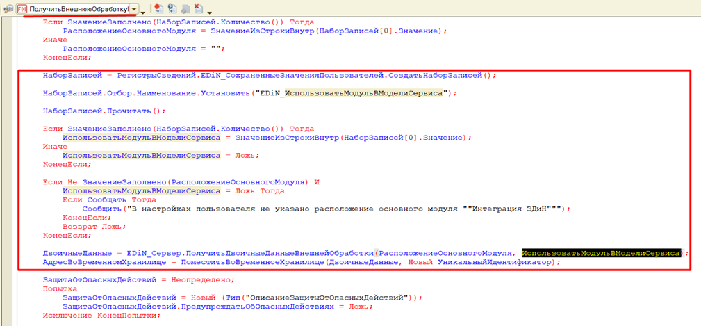 Функция «ПолучитьВнешнююОбработкуИнтеграцииEDiN» внешней назначаемой обработки модуля объекта «ВнешняяНазначаемаяОбработка_ВыгрузкаЭТТН» для управляемых форм по получению закрытой части из репозитория сайта поддержки для запуска модуля в модели сервиса должен содержать следующий код: