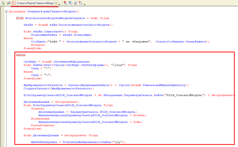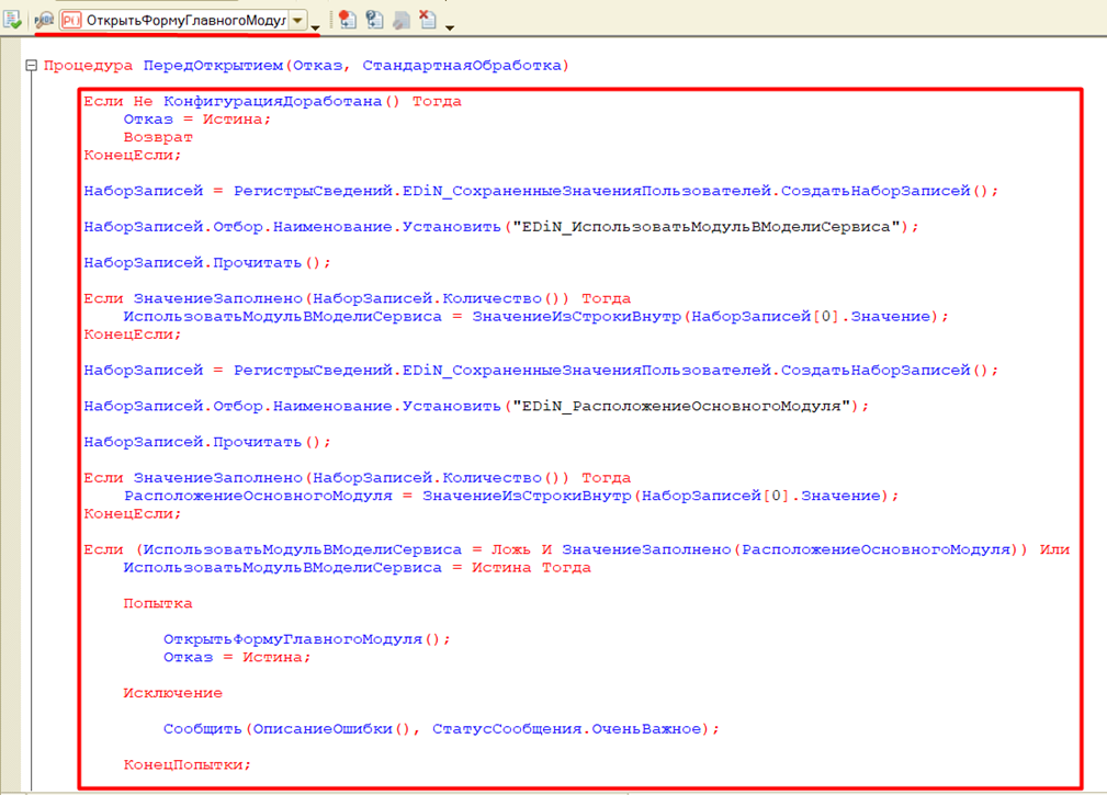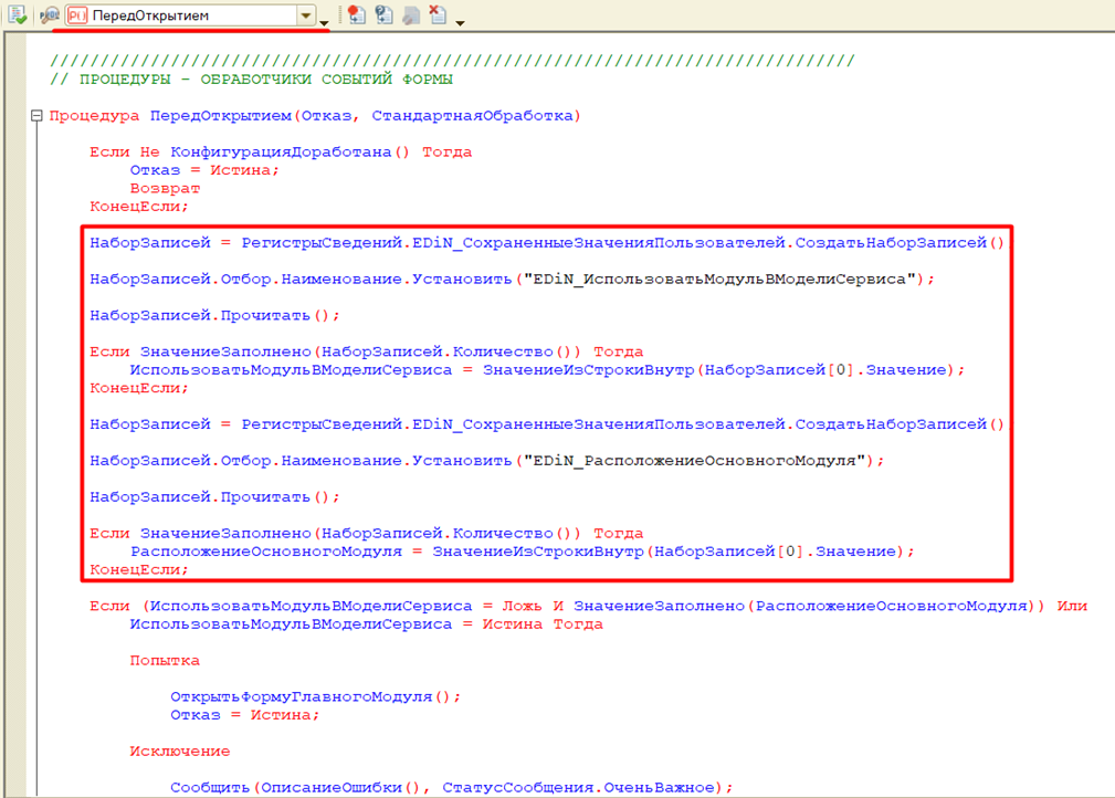 Процедуры «ПередОткрытием» и «ОткрытьФормуГлавногоМодуля» обработки формы «Запуск_Docu1c» для обычных форм по получению закрытой части из репозитория сайта поддержки для запуска модуля в модели сервиса должен содержать следующий код: