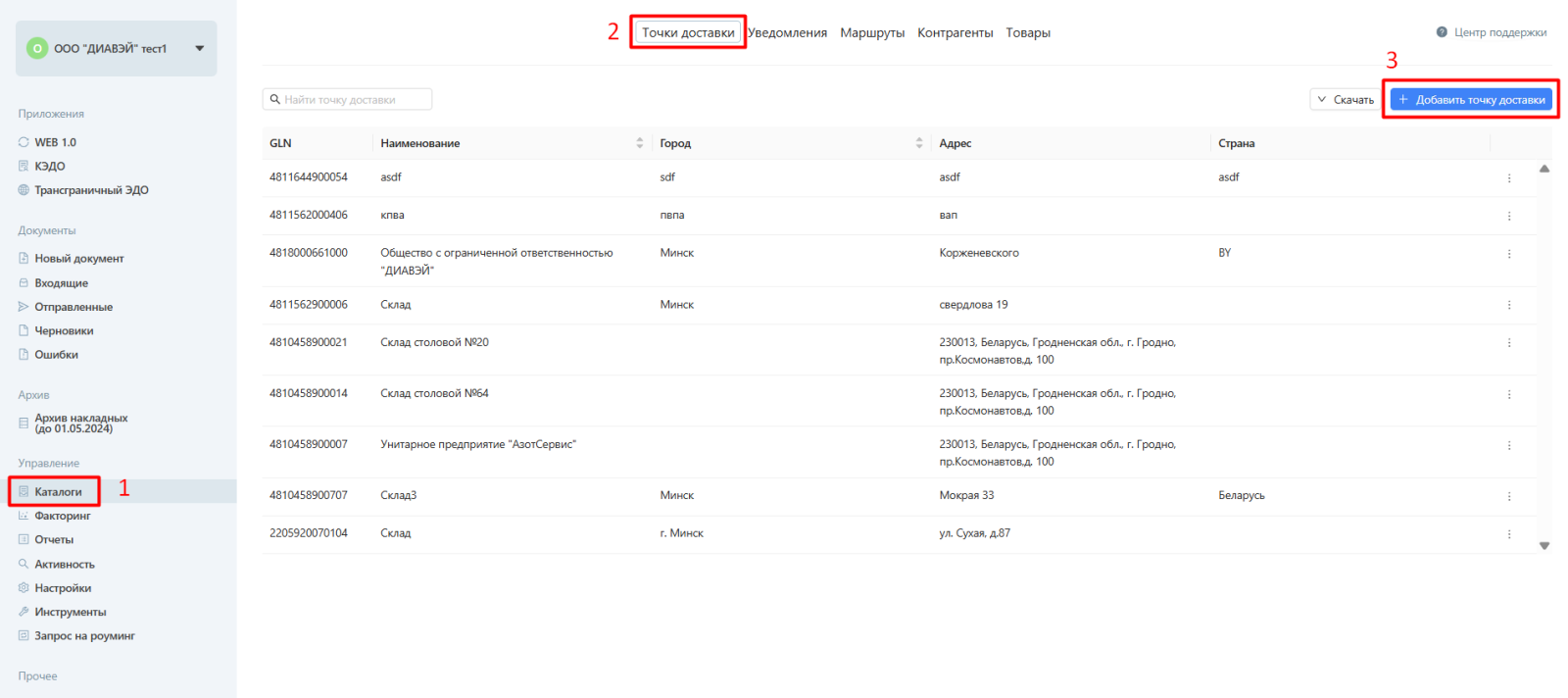 Для того, чтобы добавить точку доставки в личном кабинете, необходимо нажать на раздел "Каталоги", после чего откроется вкладка "Точки доставки". В открывшемся окне будут отображаться внесенные точки доставки для вашей организации. Добавить новую точку доставки можно, если нажать на кнопку "Добавить точку доставки".