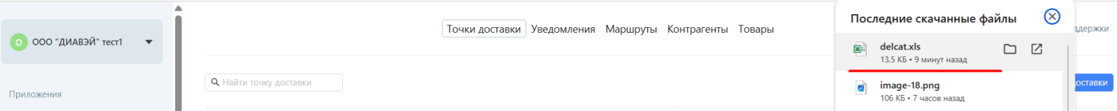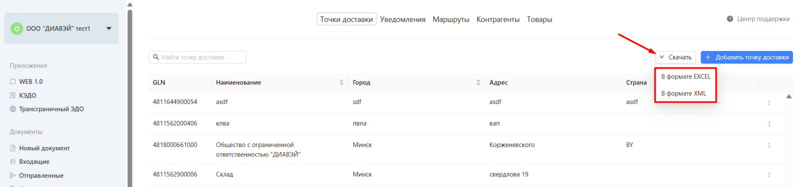 При необходимости можно скачать список точек доставки. Список можно сохранить в формате EXCEL либо XML. Для этого на странице каталога точек доставки необходимо нажать на кнопку "Скачать" и выбрать необходимый формат сохраняемого файла.