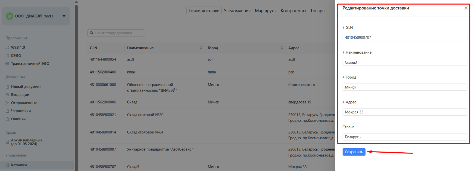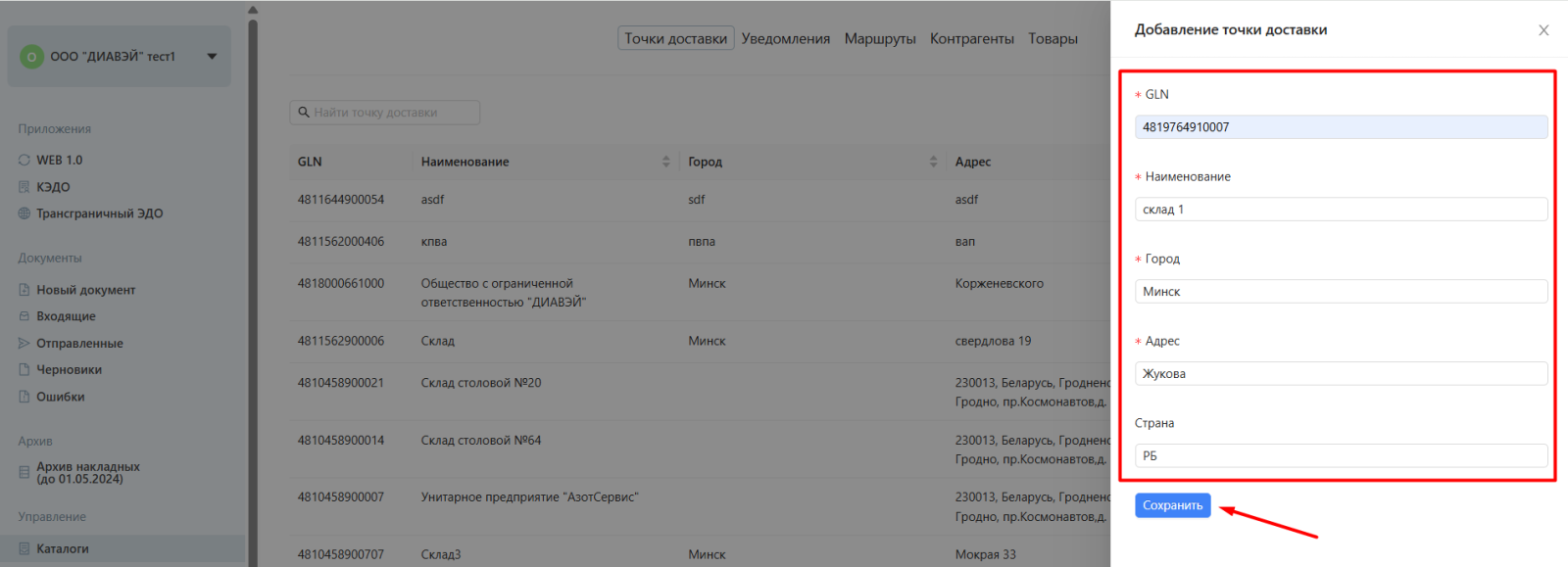 Затем откроется окно "Добавления точки доставки", в котором необходимо заполнить обязательные поля отмеченные * ( GLN, Наименование, Город и Адрес точки доставки), а после чего нажать "Сохранить".