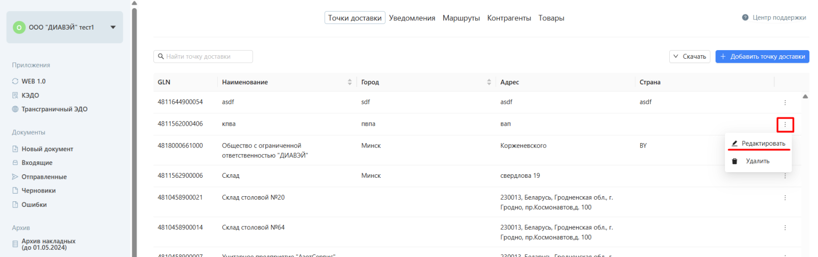 Для внесения изменений в указанной точке доставке, нужно нажать на значок "троеточие" справа от точки доставки и далее выбрать пункт "Редактировать".