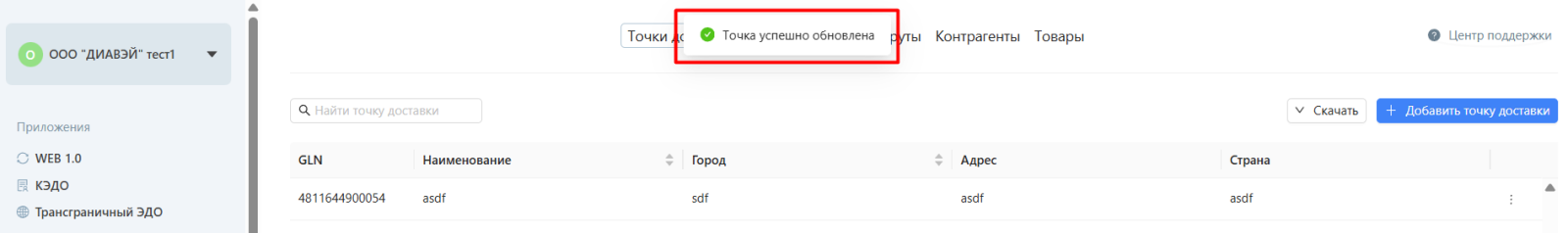 После сохранения изменений появится всплывающее окно с текстом "Точка успешна обновлена".