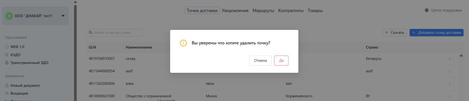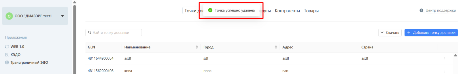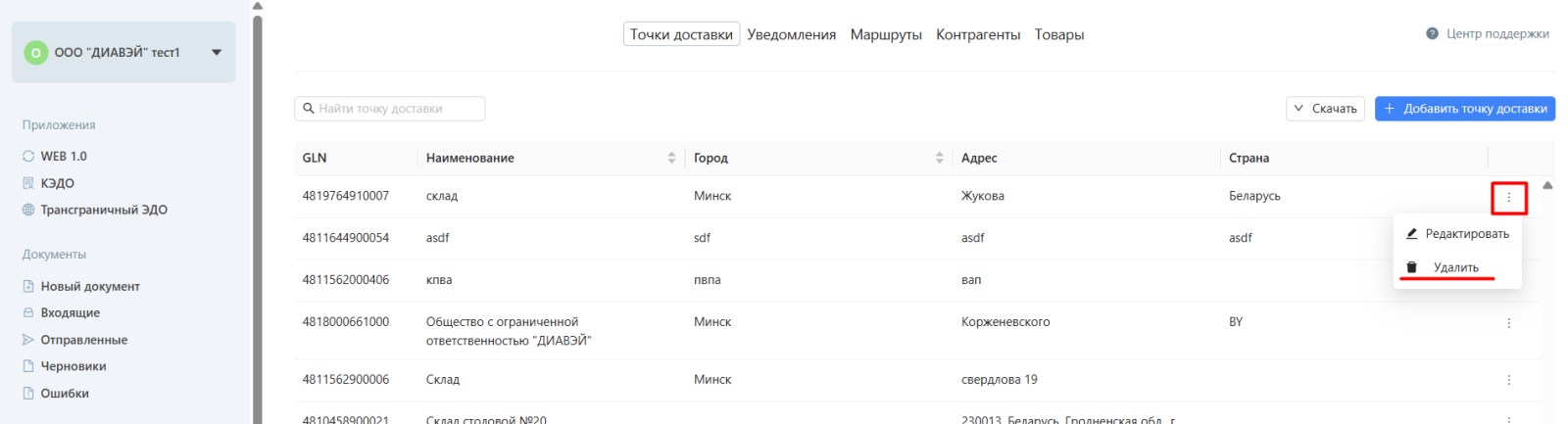 При необходимости удалить точку доставки нажмите "Удалить", на странице с точками доставки.