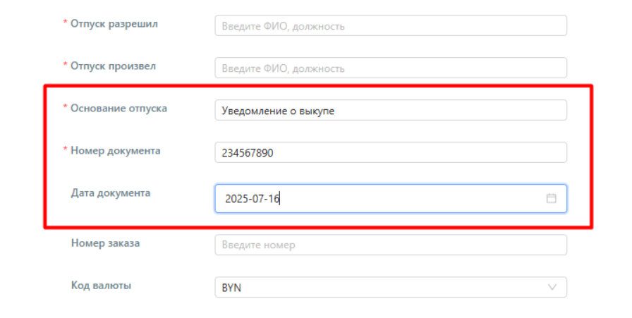 - Номер документа. Укажите номер Уведомления о выкупе, на основании которого производится отпуск товара. Указывать надо только номер, без символов.