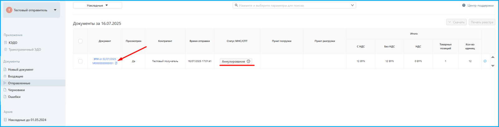 1. Перейдите в раздел Отправленные и откройте необходимую накладную со статусом "Аннулирование".