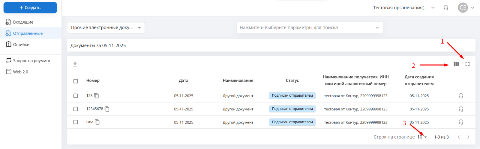 Внизу списка документов ветки "Отправленные" можно задать количество документов для отображения. Значение можно выбрать только из предложенных вариантов (10, 15, 20, 25 или 30):