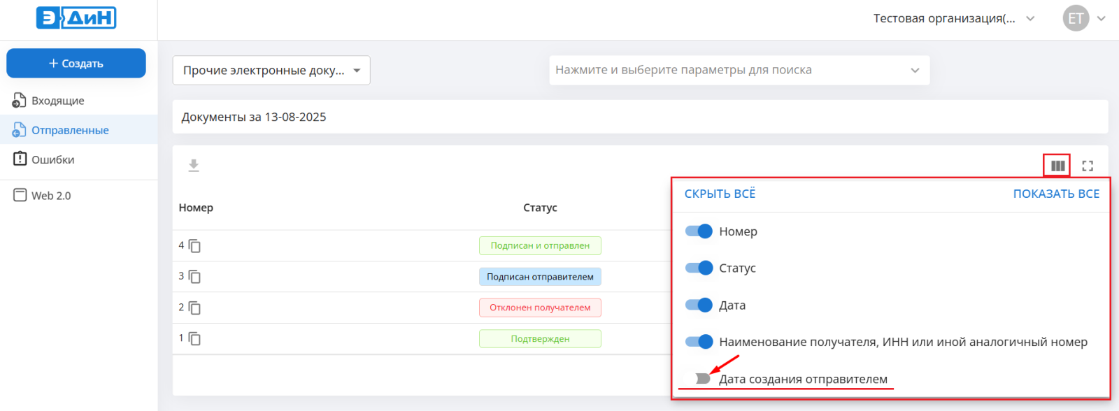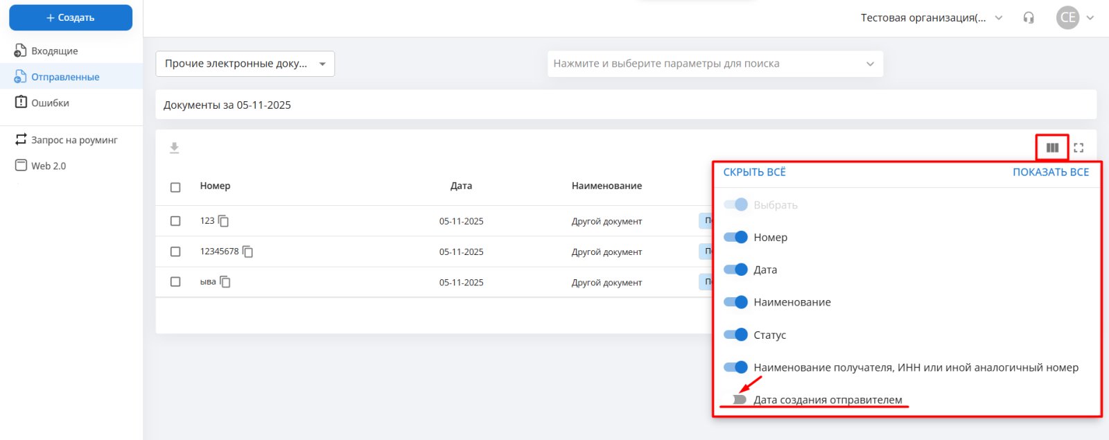 Функционал "Показать/Скрыть колонки" позволяет скрывать лишнюю информацию для пользователя с ветки "Отправленные" путем выбора необходимых для него колонок: