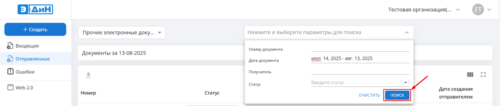 Также можно использовать другие параметры поиска документов на ветке "Отправленные":