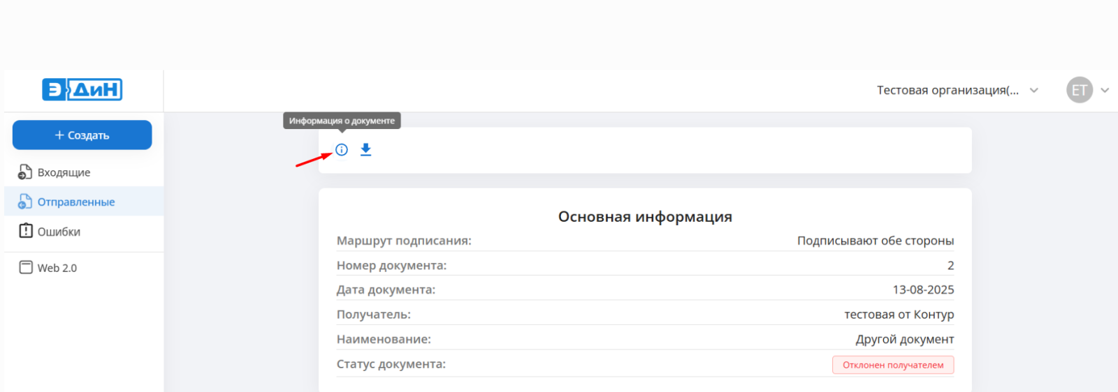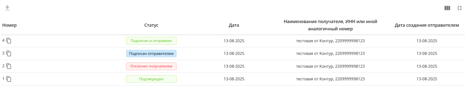 - Статус ( "В обработке", "Ожидание ответа контрпровайдера", "Отклонён получателем", "Подписан и отправлен", "Подписан отправителем", "Подтверждён")