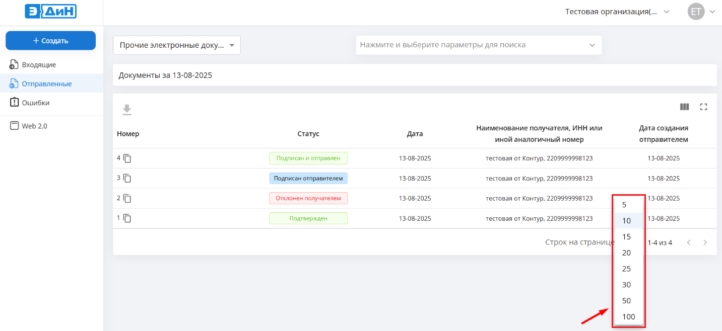 Внизу списка документов ветки "Отправленные" можно задать количество документов для отображения. Значение можно выбрать только из предложенных вариантов (5, 10, 15, 20, 25, 30, 50 или 100):