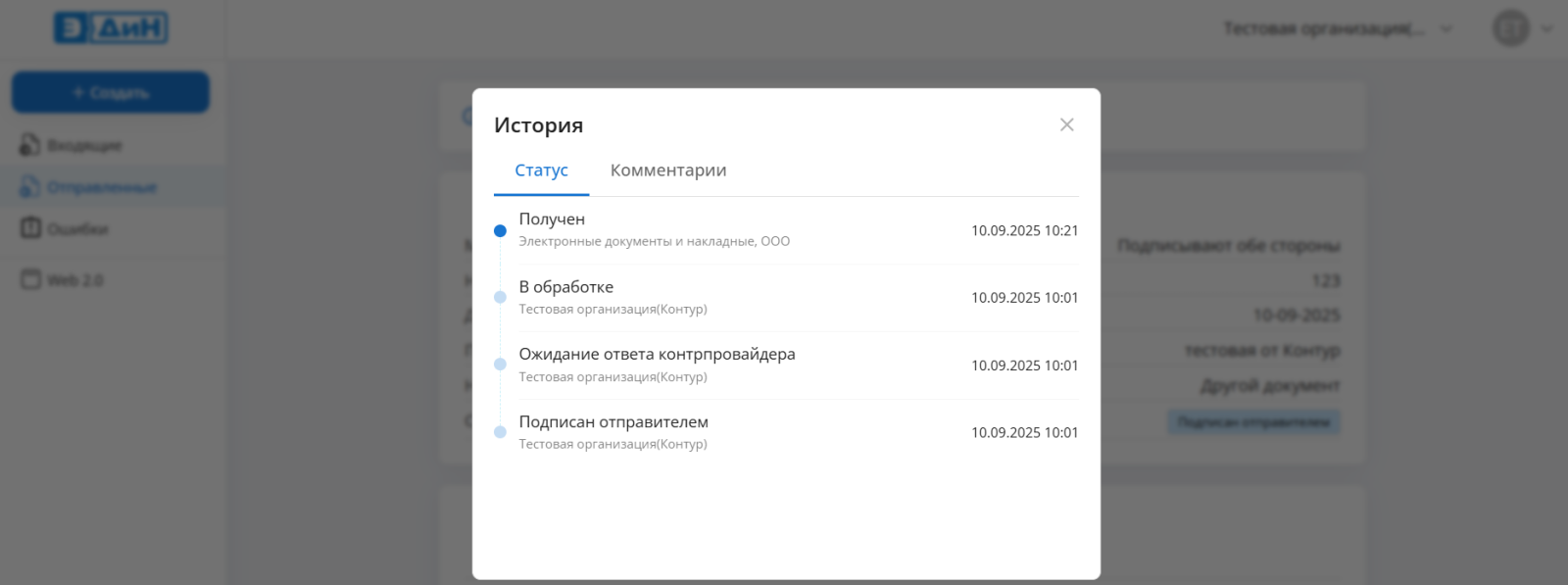 Если выбираем "История", можно просмотреть историю, как менялись статусы документа и комментарии, оставленные при подписании контрагентом: