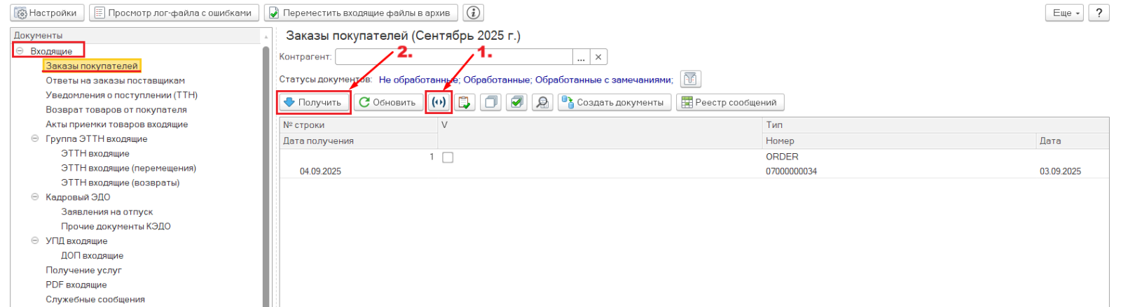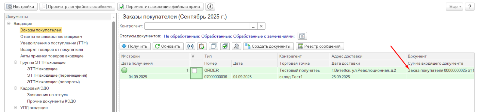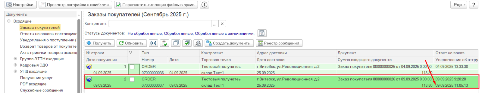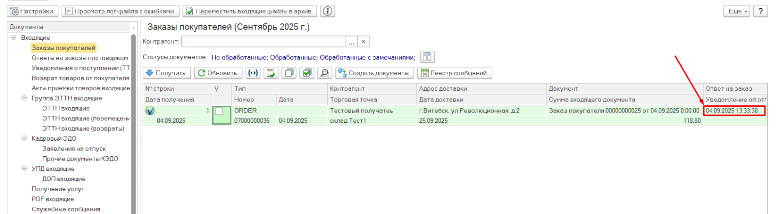 Вернувшись на ветку "Входящие"->"Заказы покупателей" можно увидеть, что в строке с обработанным заказом появилась отметка о дате и времени выгрузки ответа. Так можно проверять, в каком состоянии заказ и какие документы по нему были уже выгружены. Пиктограмма в строке с заказом будет следующей: .