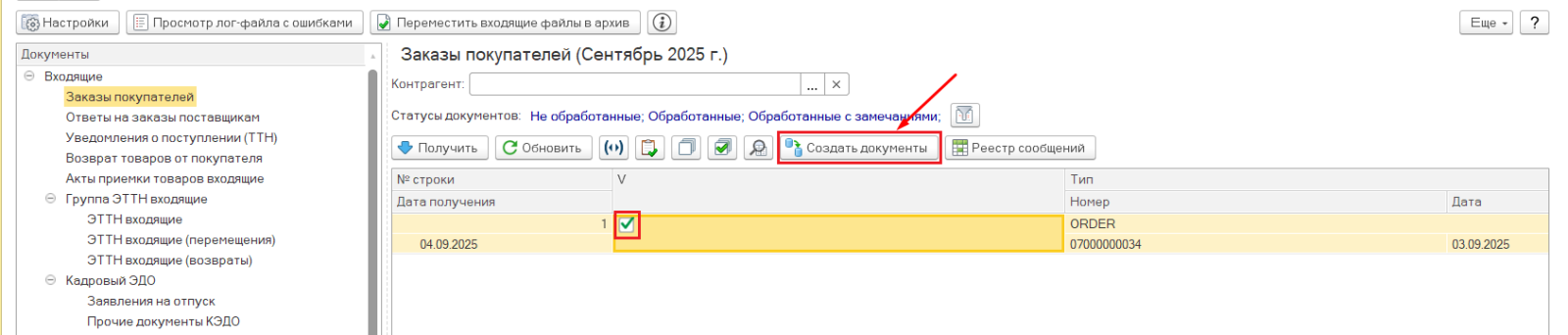 Далее заказы загружаются в 1с. Для этого необходимо отметить необходимые документы галочкой и нажать на кнопку "Создать документы".