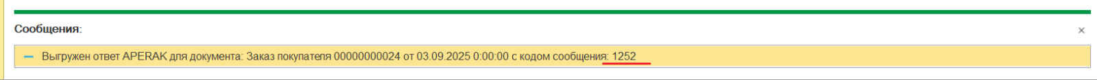В подтверждение успешного создания заказа выгружается служебное сообщение с кодом 1252.