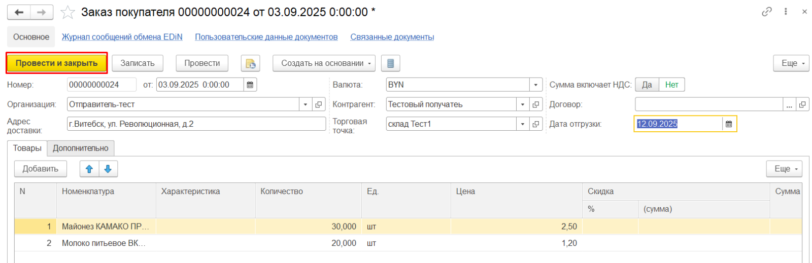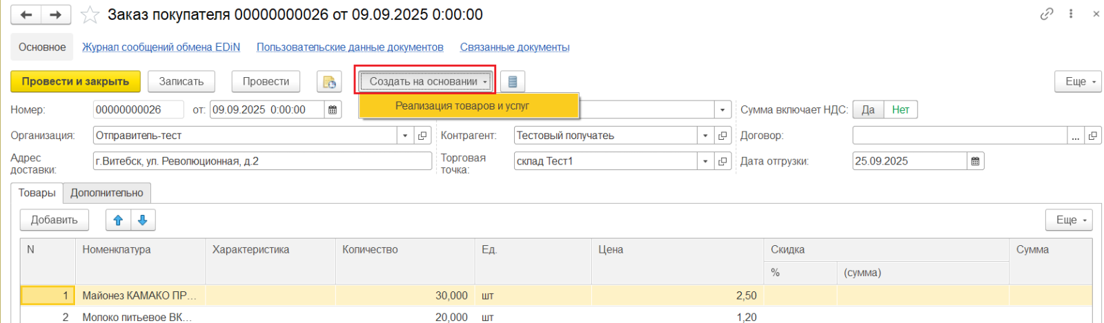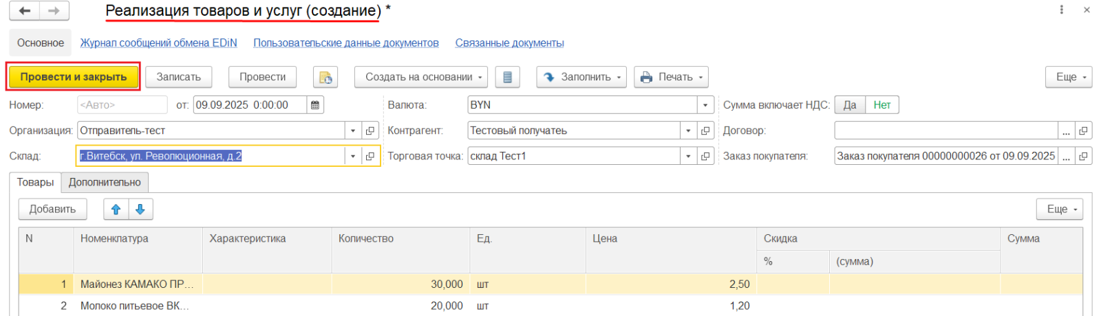 Будет создан документ "Реализация товаров и услуг". Его необходимо проверить, затем провести и закрыть, нажав на соответствующую кнопку.