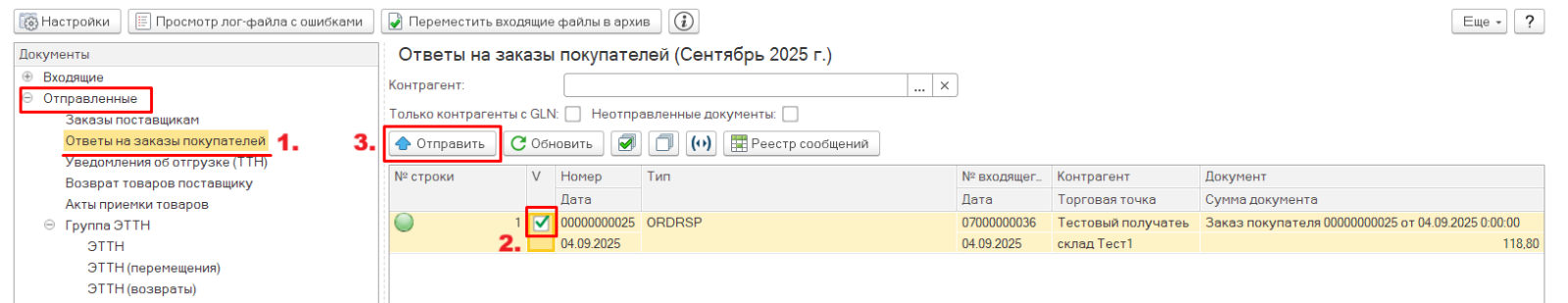 После того как заказ проверен и, при необходимости, отредактирован можно отправить ответ на заказ. Для этого необходимо перейти на ветку "Отправленные"->"Ответы на заказы покупателей", найти нужный документ (документы), отметить галочкой и нажать на кнопку "Отправить".