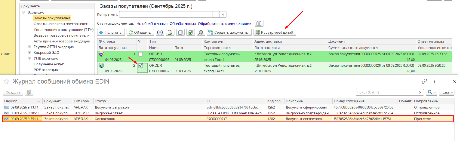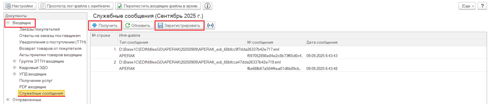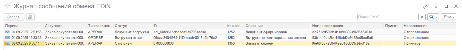 Далее покупатель согласовывает ответ на своей стороне: отправляет подтверждение либо отказ. После этого поставщику необходимо получить и зарегистрировать служебные сообщения в модуле на ветке "Входящие"->"Служебные сообщения".